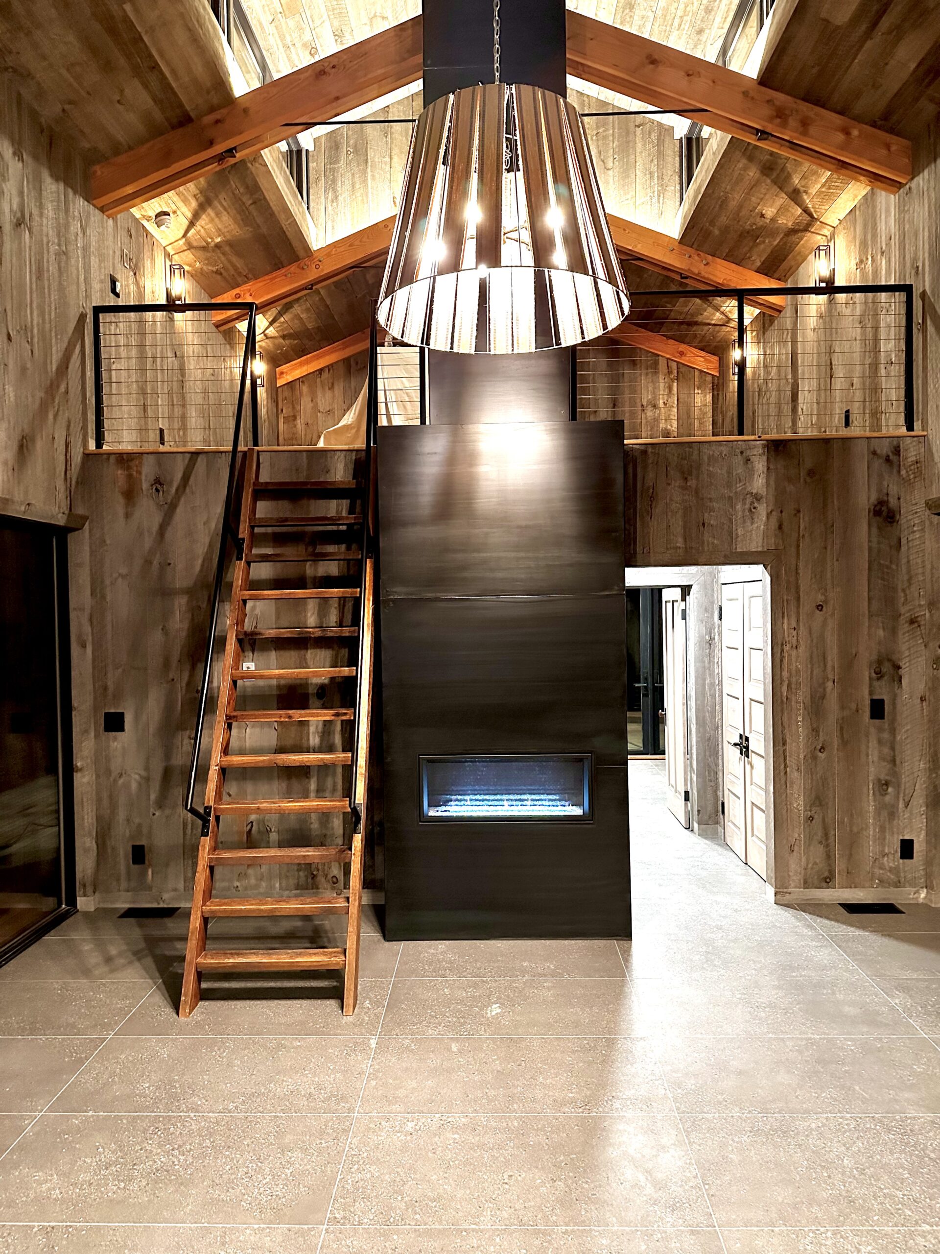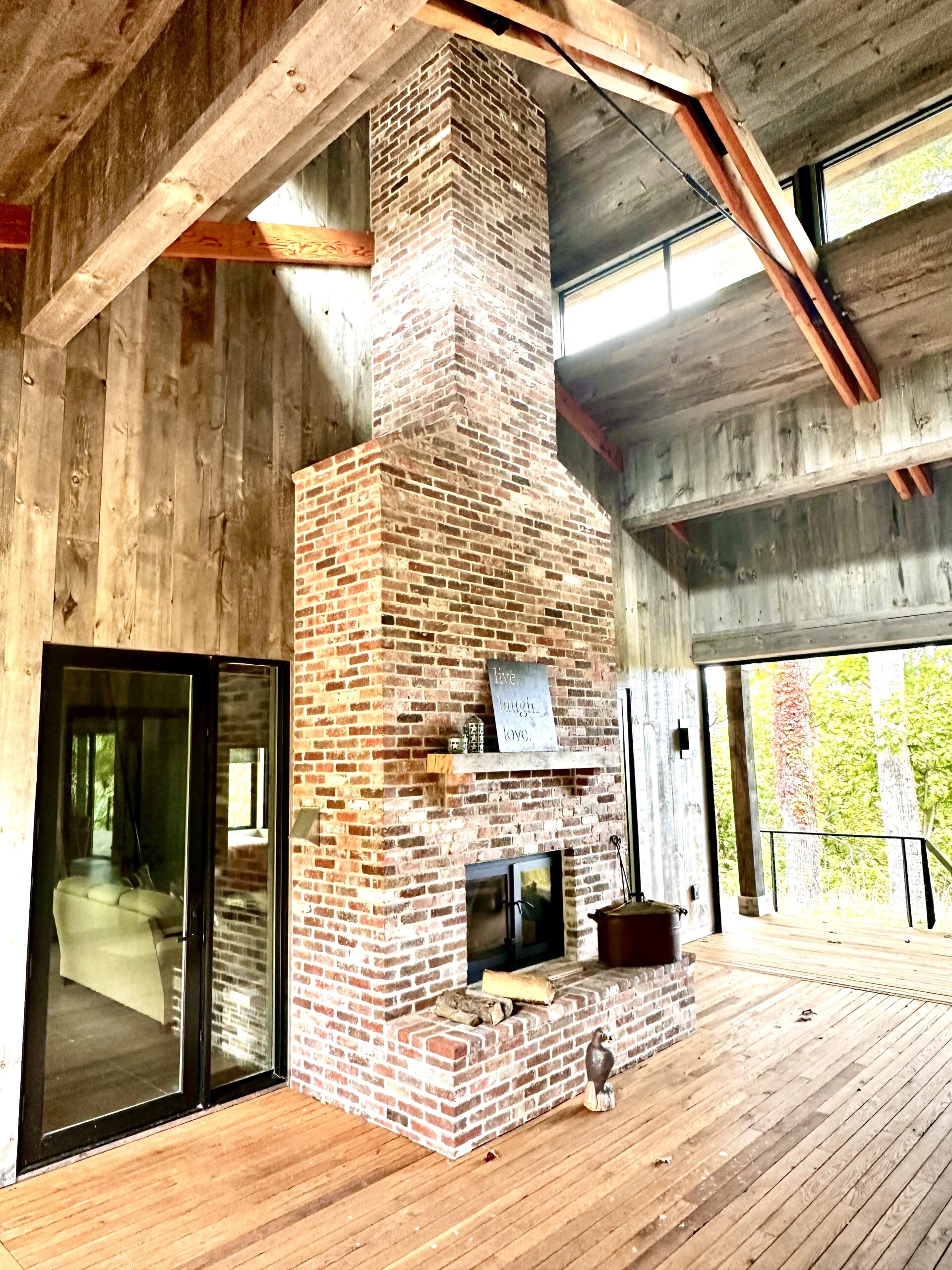 Further echoing the ethos of sustainability, the project embraced the use of locally sourced and reclaimed materials wherever possible. From the reclaimed brick cladding the two-sided wood- burning fireplace, sourced from Richmond, Virginia, to the sleek modern gas fireplace clad in mill-finish steel, every element of the design spoke to a reverence for the past and a commitment to the future.