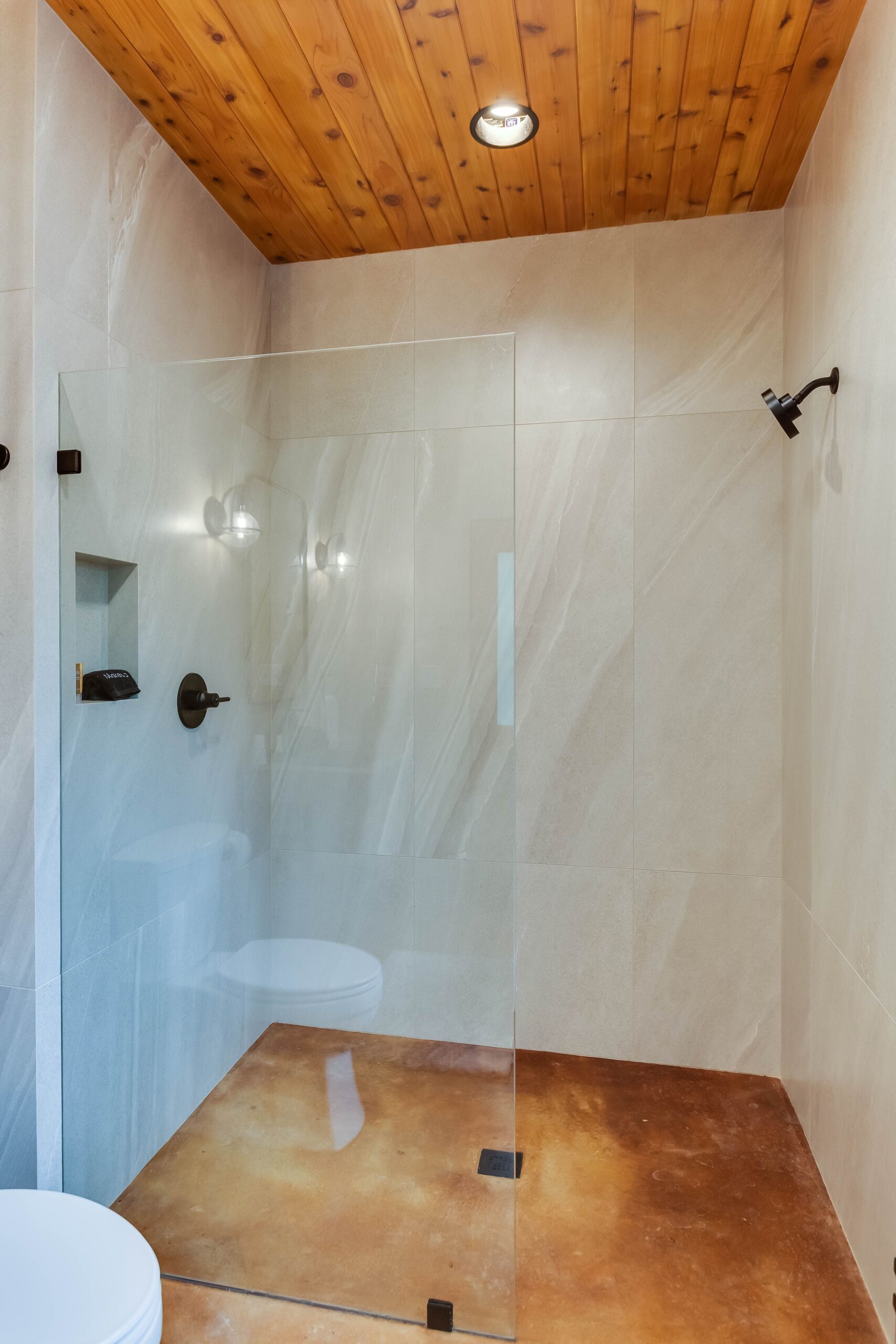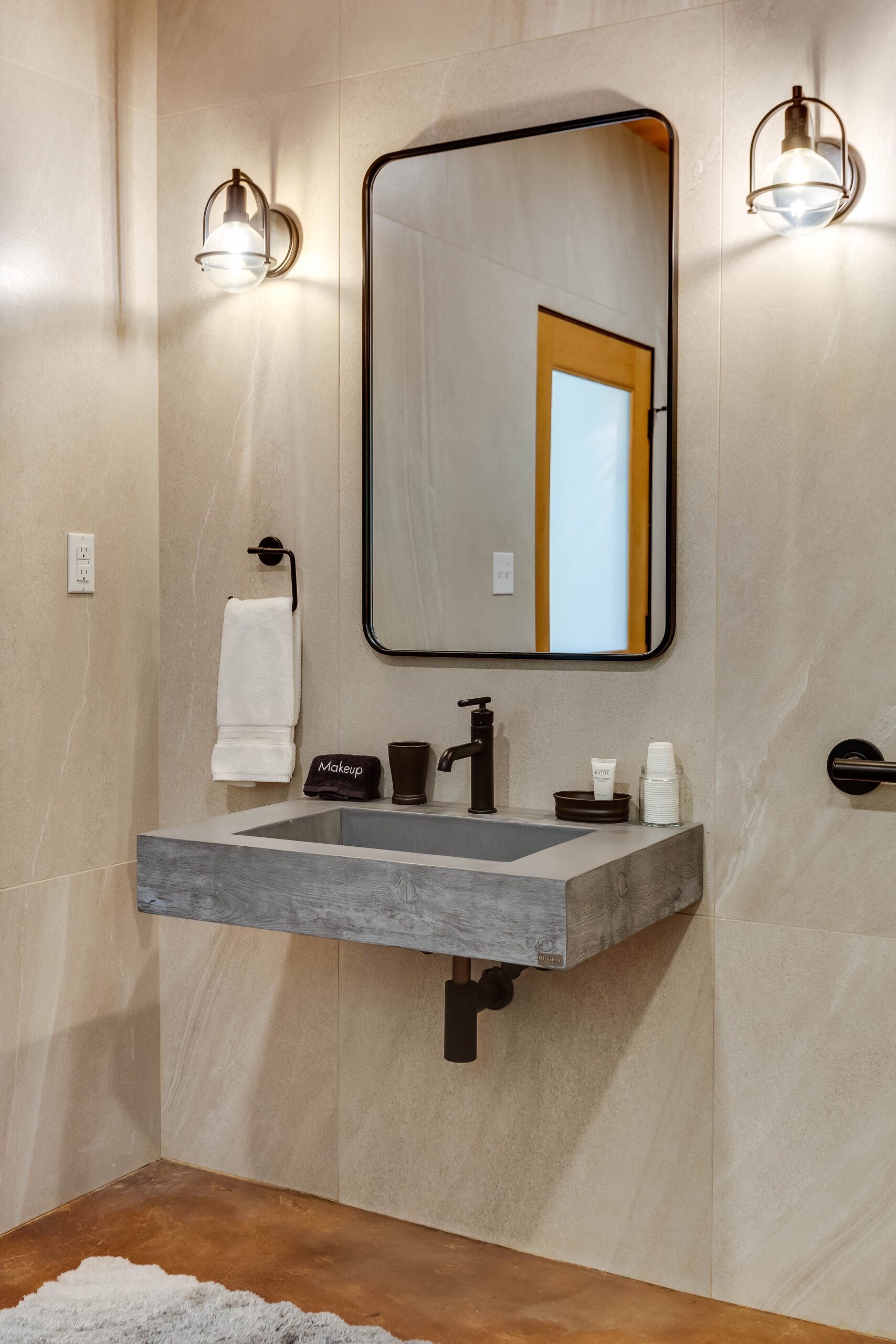 Every detail of the bathhouse was thoughtfully considered to evoke a sense of luxury and serenity. Western red cedar columns grace the exterior, supporting a standing seam metal roof and exterior walls adorned with stone and board and-batten siding. Inside, acid-stained concrete floors, heated by a hydronic radiant system, provide warmth and comfort underfoot. Floor-to-ceiling tile, reminiscent of limestone, adorns the walls, creating an atmosphere of timeless elegance. Floating concrete vanities add the finishing touch, marrying form and function in perfect harmony.