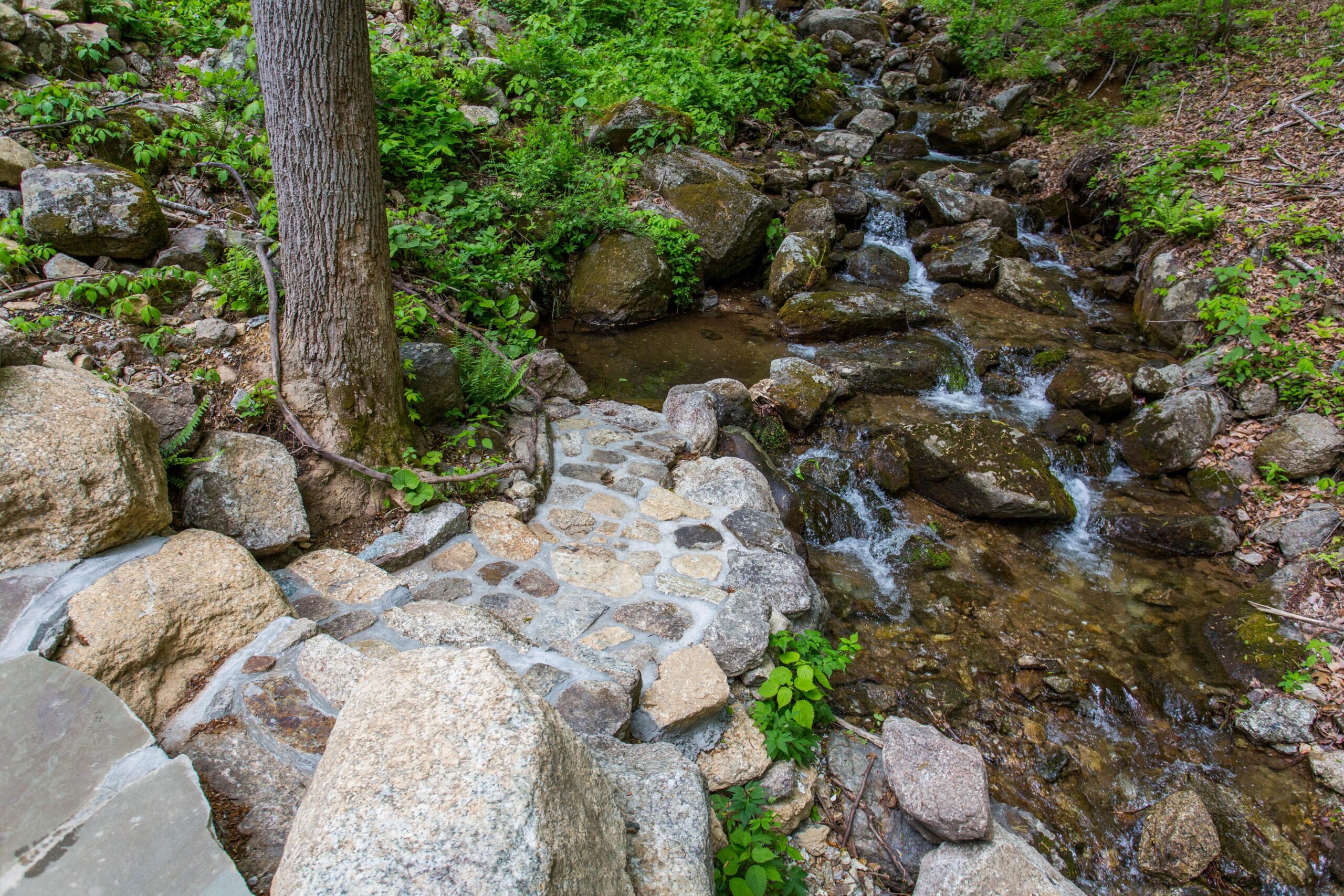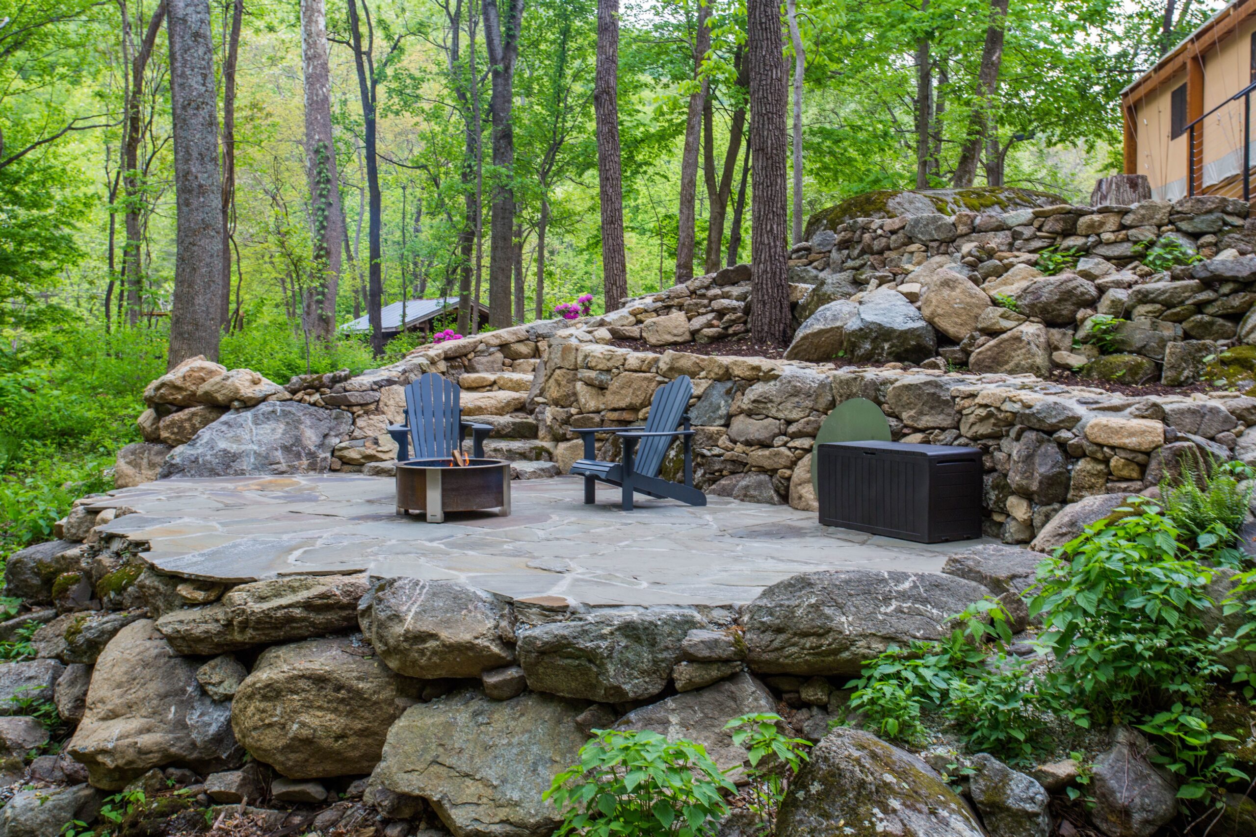 The vision for each glamping site began with the idea of elevating camping to a new level of sophistication. Picture this: Davis Tents perched atop deck platforms, with front “porches” extending over the stream below, offering guests a front-row seat to nature’s symphony. Leveraging the abundant natural rock formations, we sculpted cascading levels for each site, mirroring the flow of the stream as it descended the mountainside.