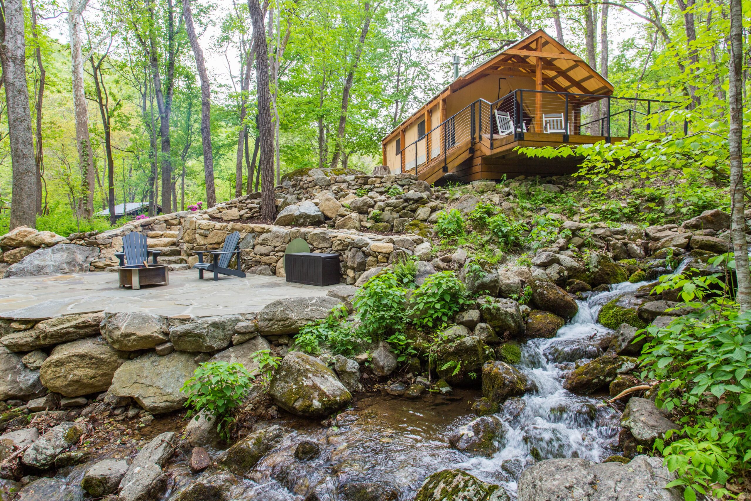 At the heart of our vision for the Retreat at Crabtree Falls was a deep reverence for the surrounding natural beauty. We were entrusted with the task of crafting four glamping sites and a bathhouse along the tranquil Lick Branch, which meanders along the eastern boundary of the property. Inspired by the gentle cascade of mountain water and the rugged charm of the landscape, we set out to create an experience that seamlessly integrated luxury with nature.
