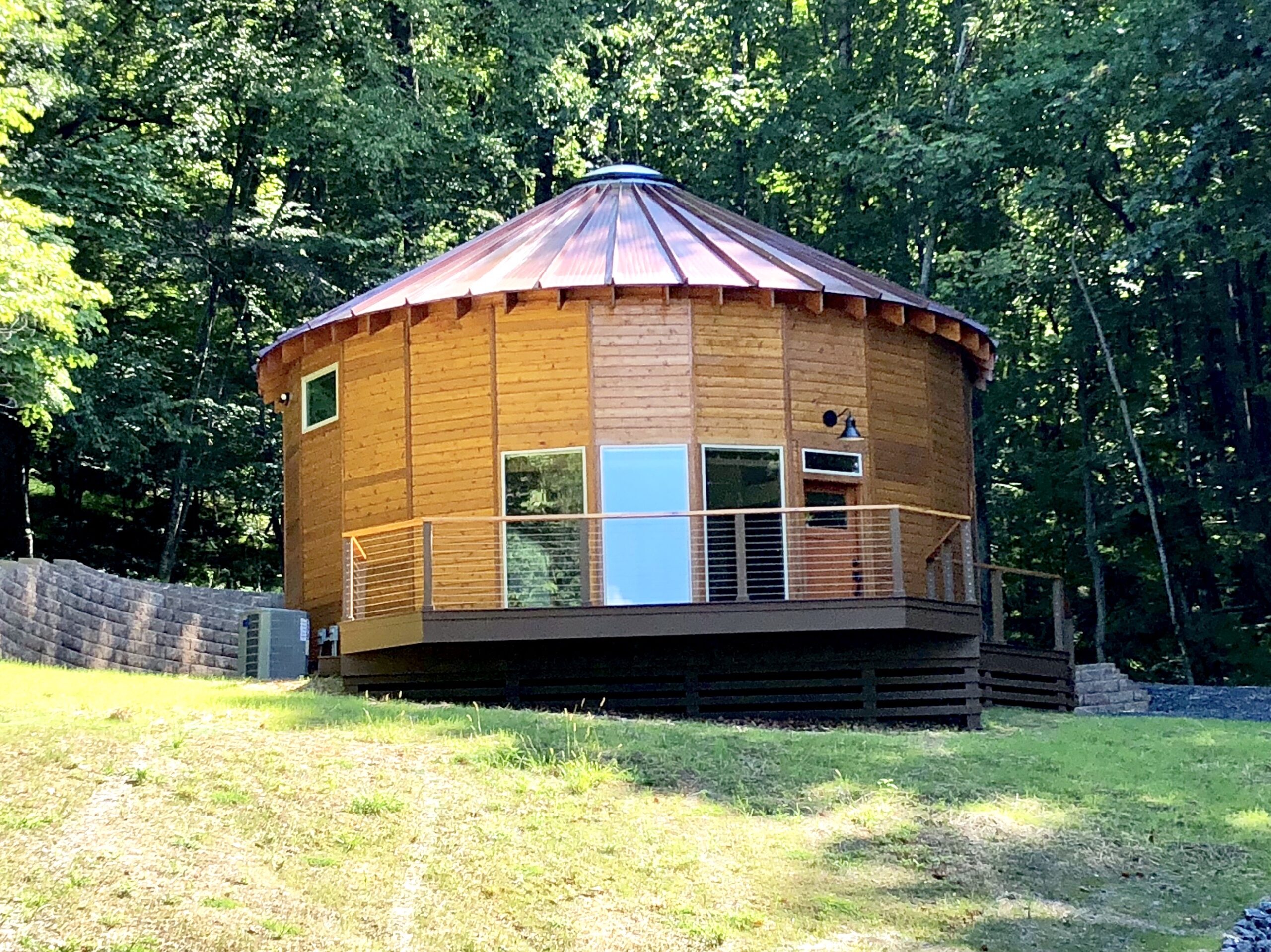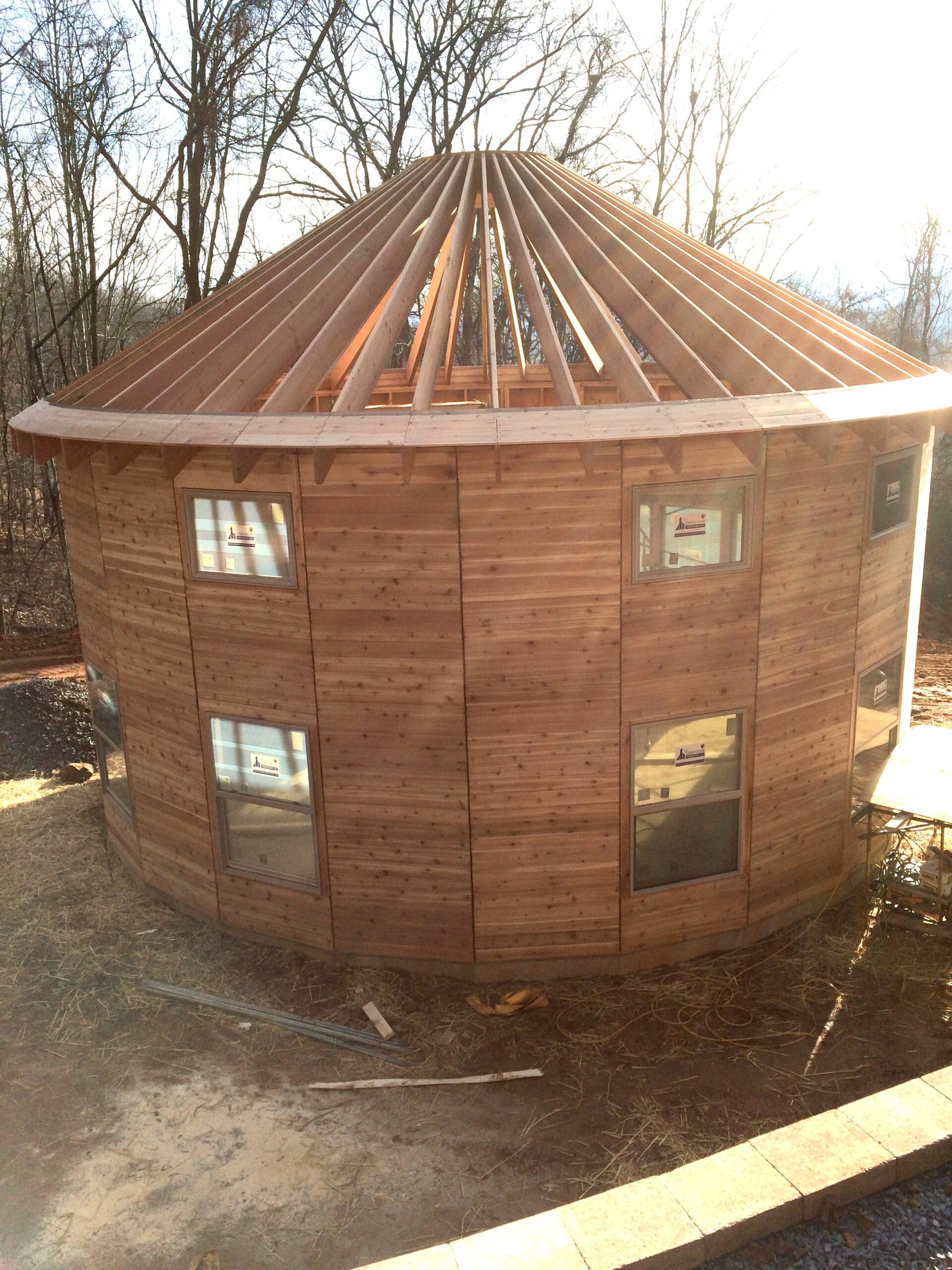 Sourced from the renowned Smiling Woods Yurt company, this innovative kit transforms into a cozy retreat nestled in nature. The kit arrived with 24 prebuilt wall sections that we stood and assembled on our radiant heated slab foundation.