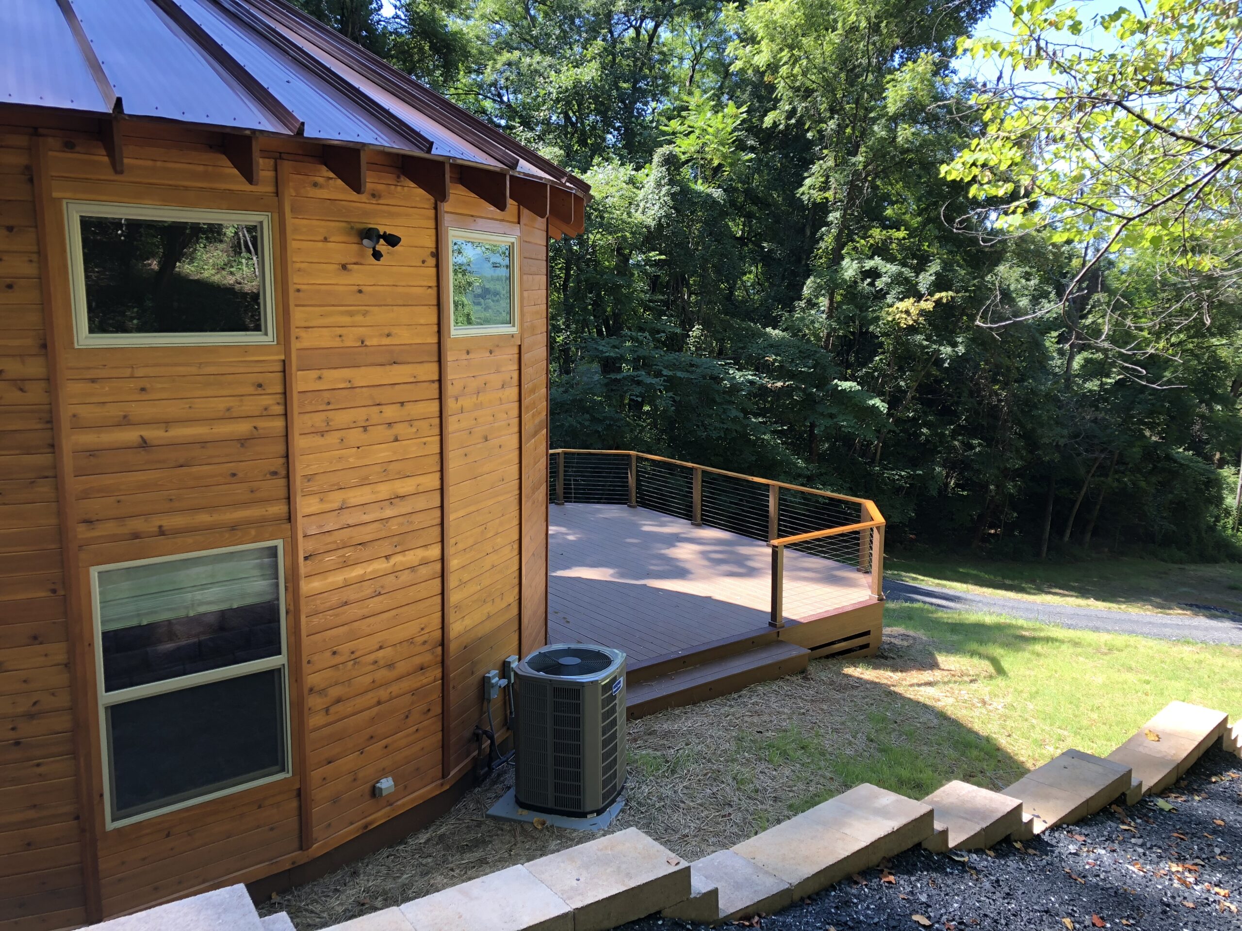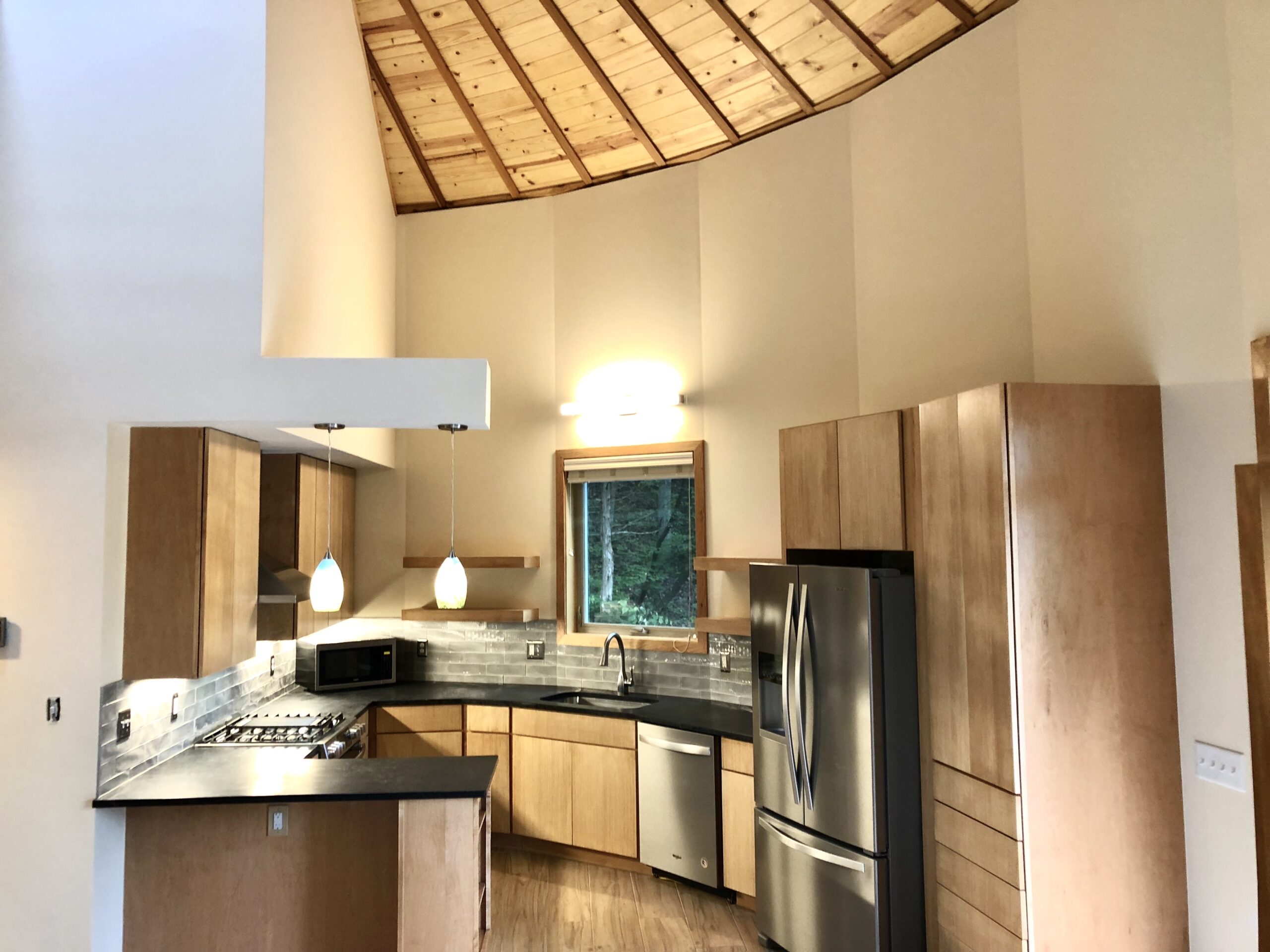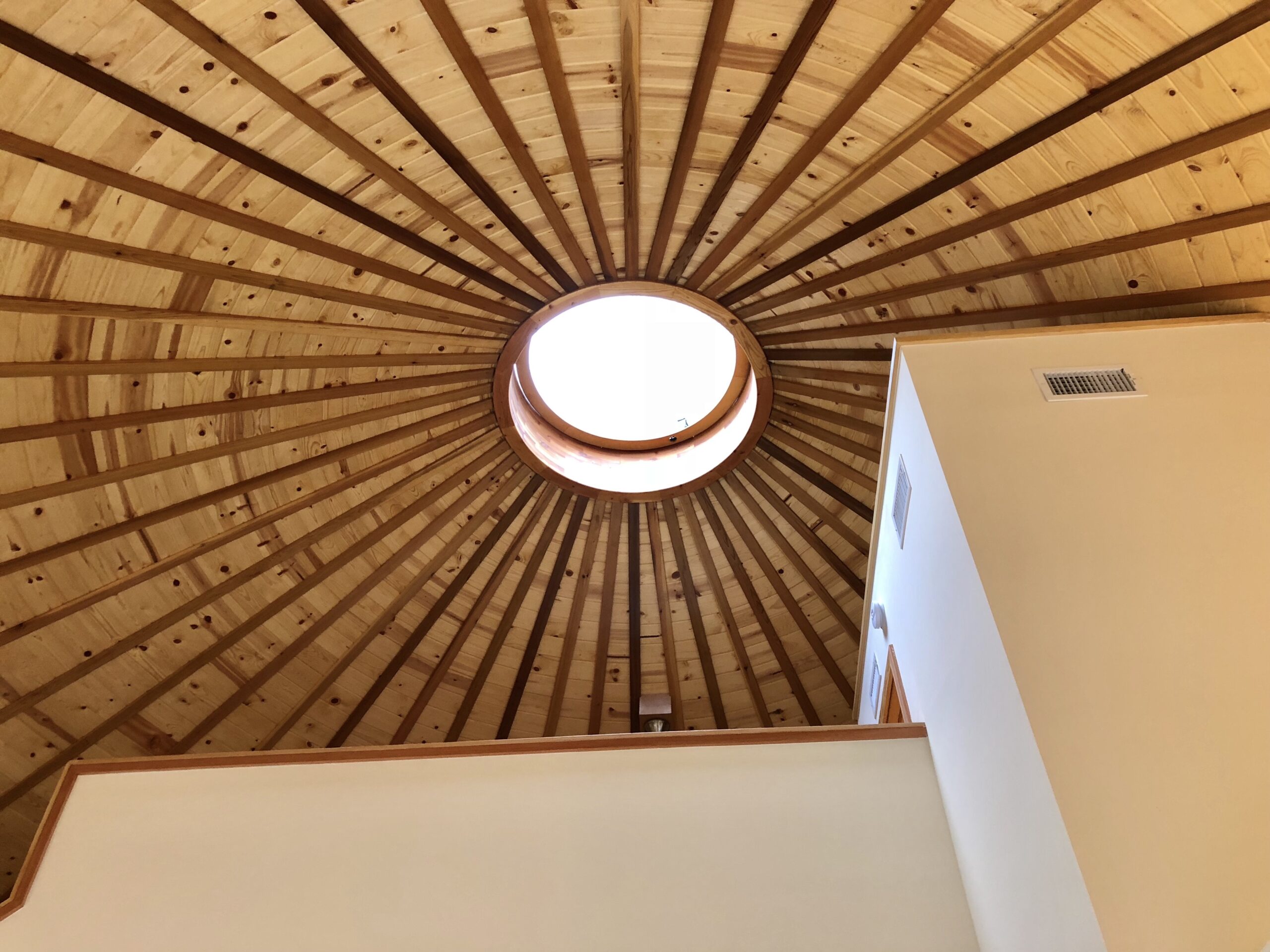 A circular ring served as the apex of the home, and a six foot dome skylight capped the roof. The geometry of the rafters and ring make for a stunning ceiling. Crafting Comfort and Sustainability: We made selections designed to harmonize with the environment while providing a comfortable living space. From the durable wood frame to the energy-efficient insulation, every aspect of the construction prioritizes sustainability without compromising on quality or style.